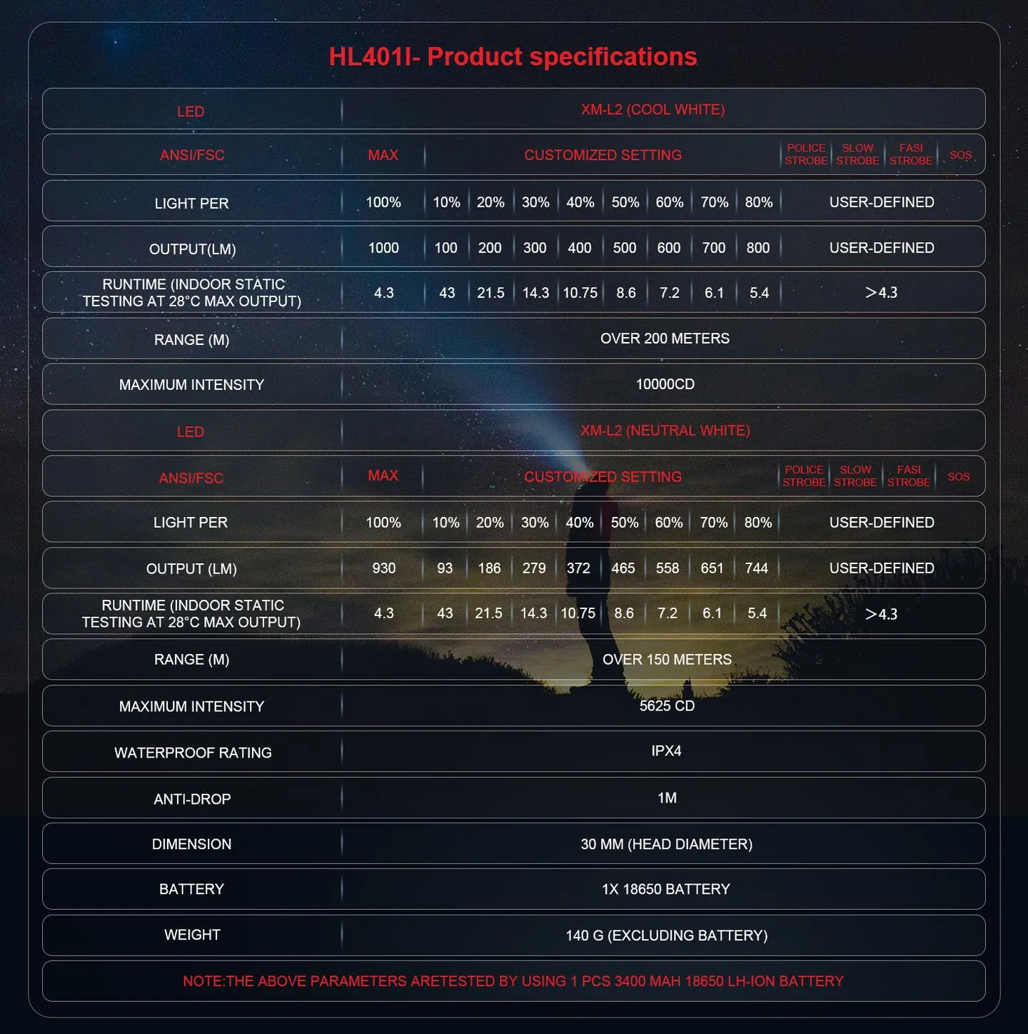 1. 버전 CW : (쿨 화이트 ) 빔, 1000 루멘, 빔 거리 200 미터, 색온도: 5000K-6800K