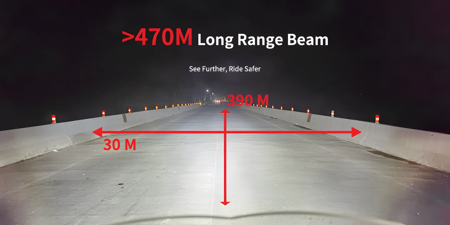 - 조명 거리 - -가장 어두운 환경에서도 선명하게 보고 자신감 있게 라이딩하세요.