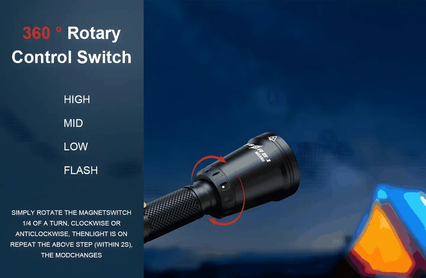 - 360-degree rotated magnet control switch to turn on/off and brightness mode of flashlight