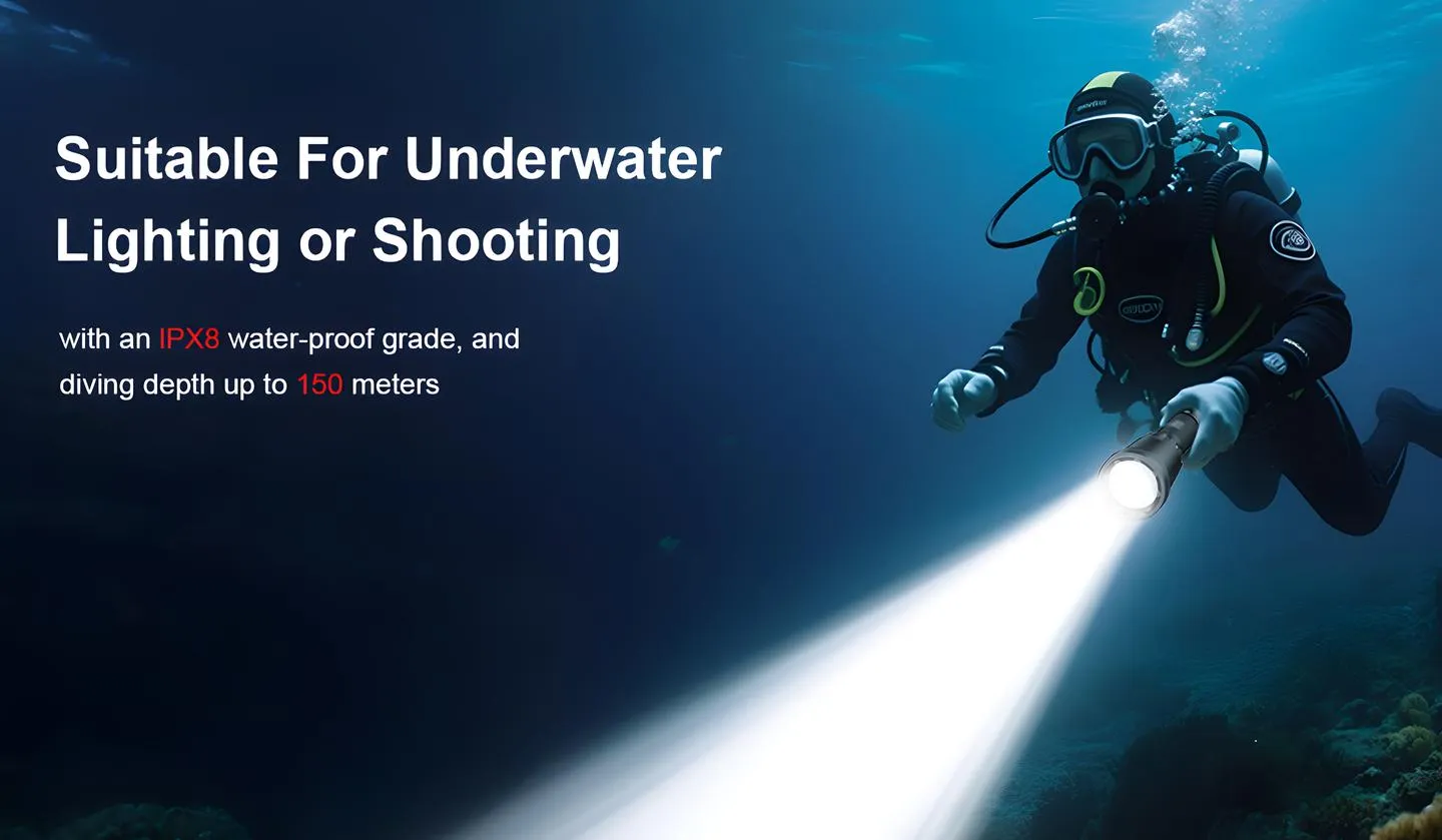 Engineered with diver safety in mind, the FEREI 158II underwater flashlight features a smart circuit system that actively protects against overheating, over-discharge, and incorrect battery polarity—helping to prevent malfunctions and ensure reliable performance in critical situations. Its durable construction, including a corrosion-resistant aerospace-grade aluminum body and IPX8 waterproof rating, guarantees stable operation even in deep, high-pressure environments. The intuitive magnetic switch allows for quick, one-handed control, minimizing distractions, while the low-battery warning provides timely alerts to avoid unexpected power failure. Built to meet the demands of professional divers, this light delivers the safety and confidence needed for any underwater mission.