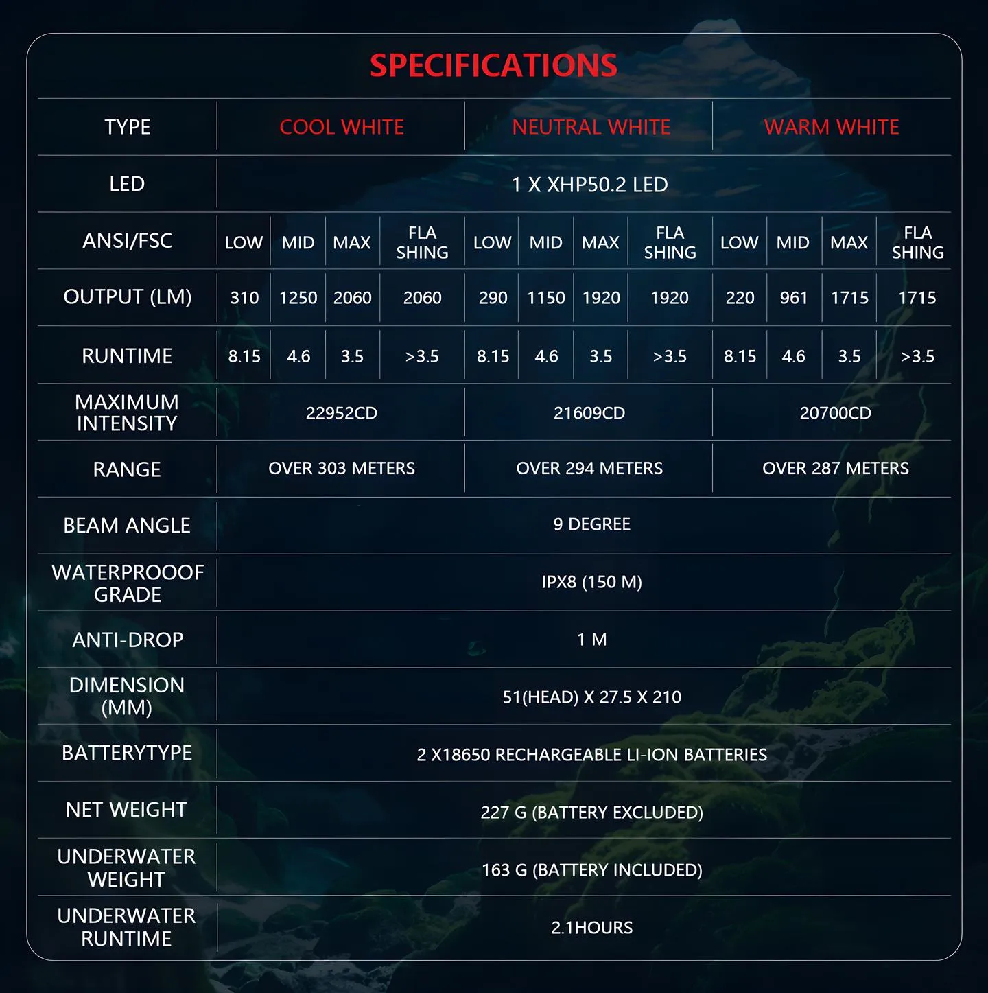 - Delivers powerful, clear illumination for deep underwater exploration and low-light surface missions