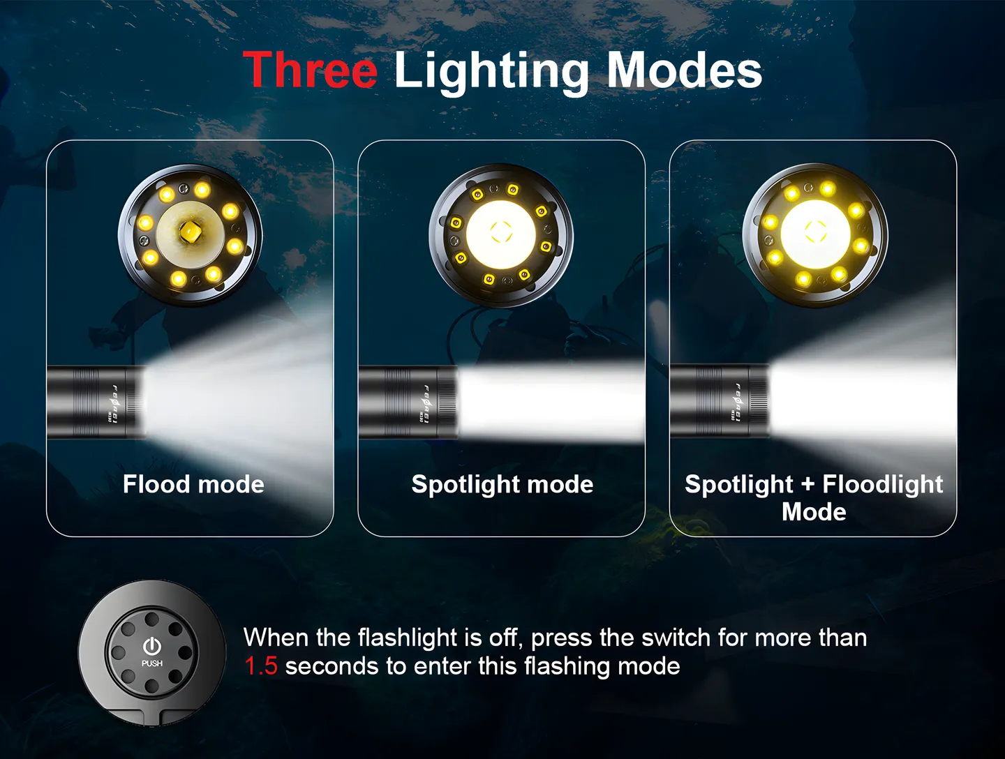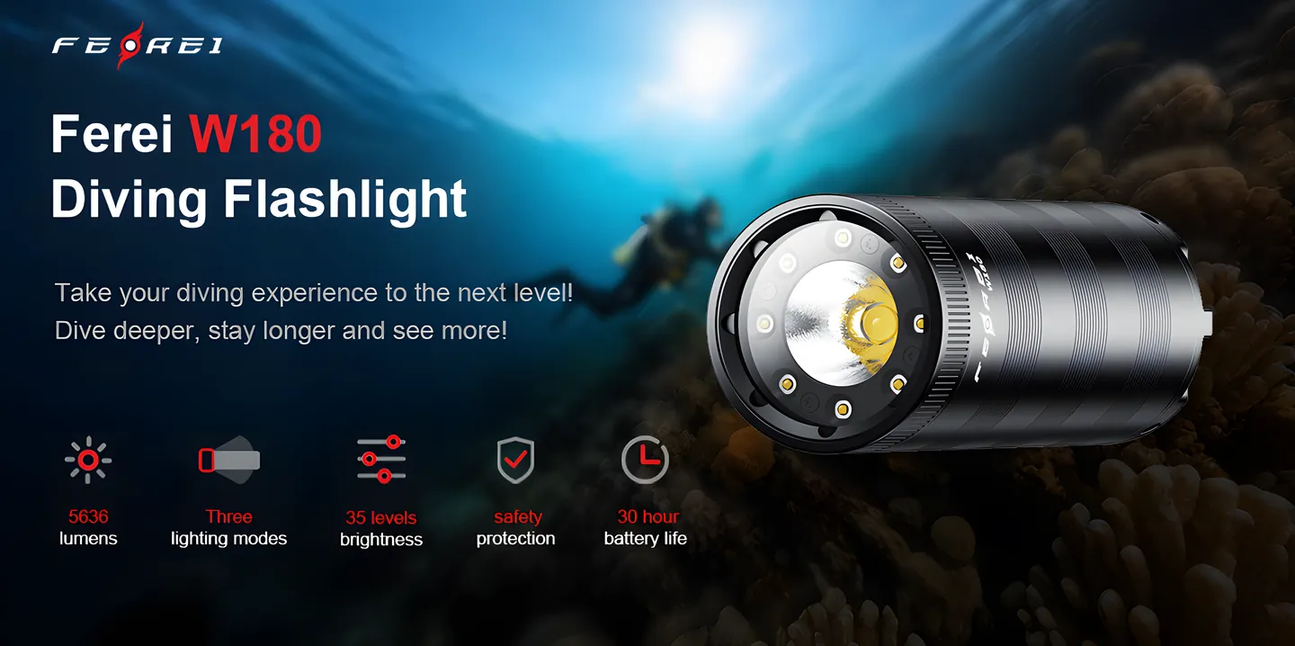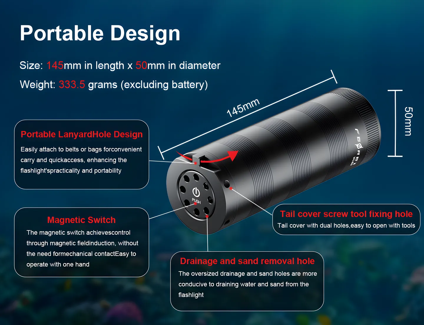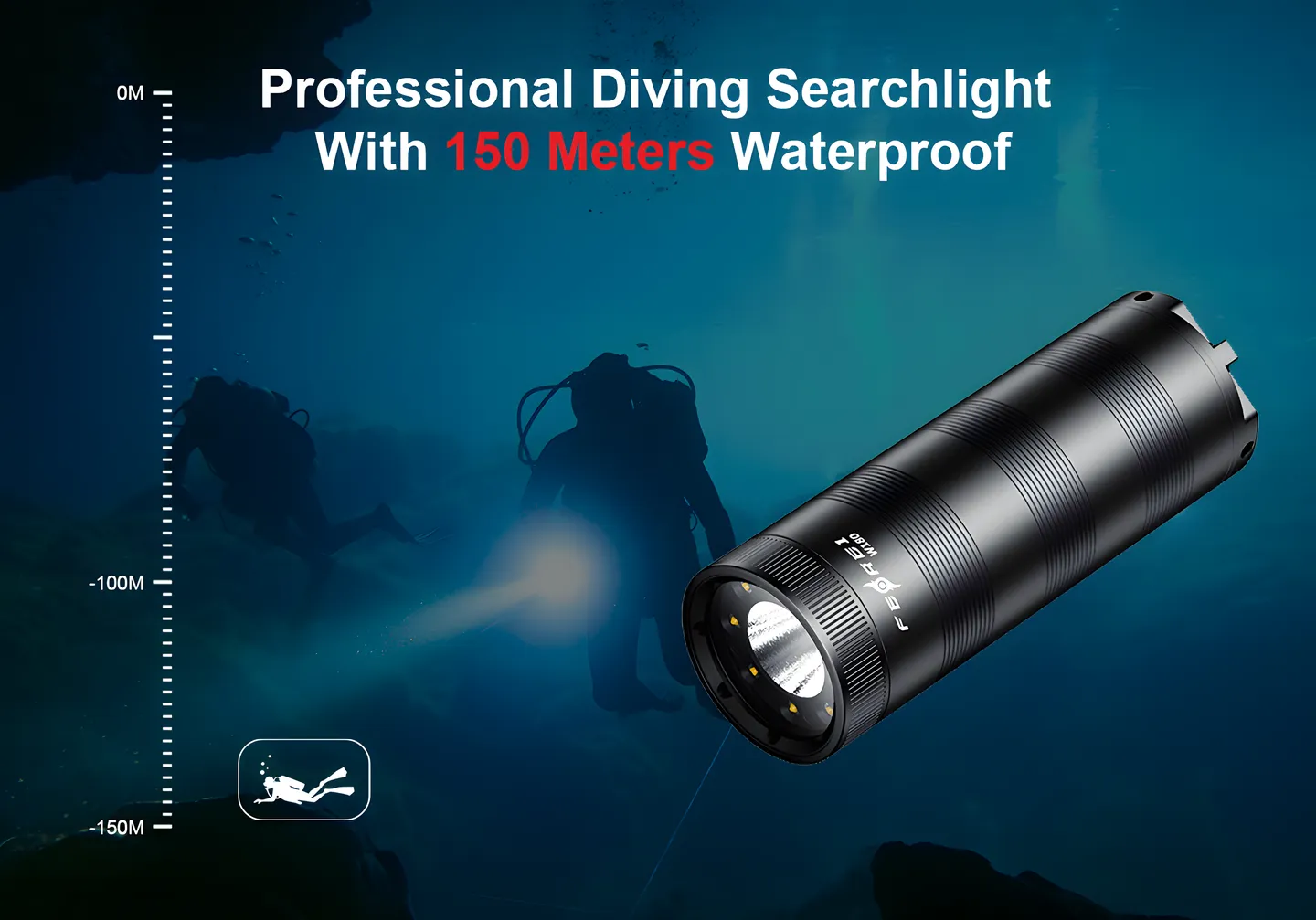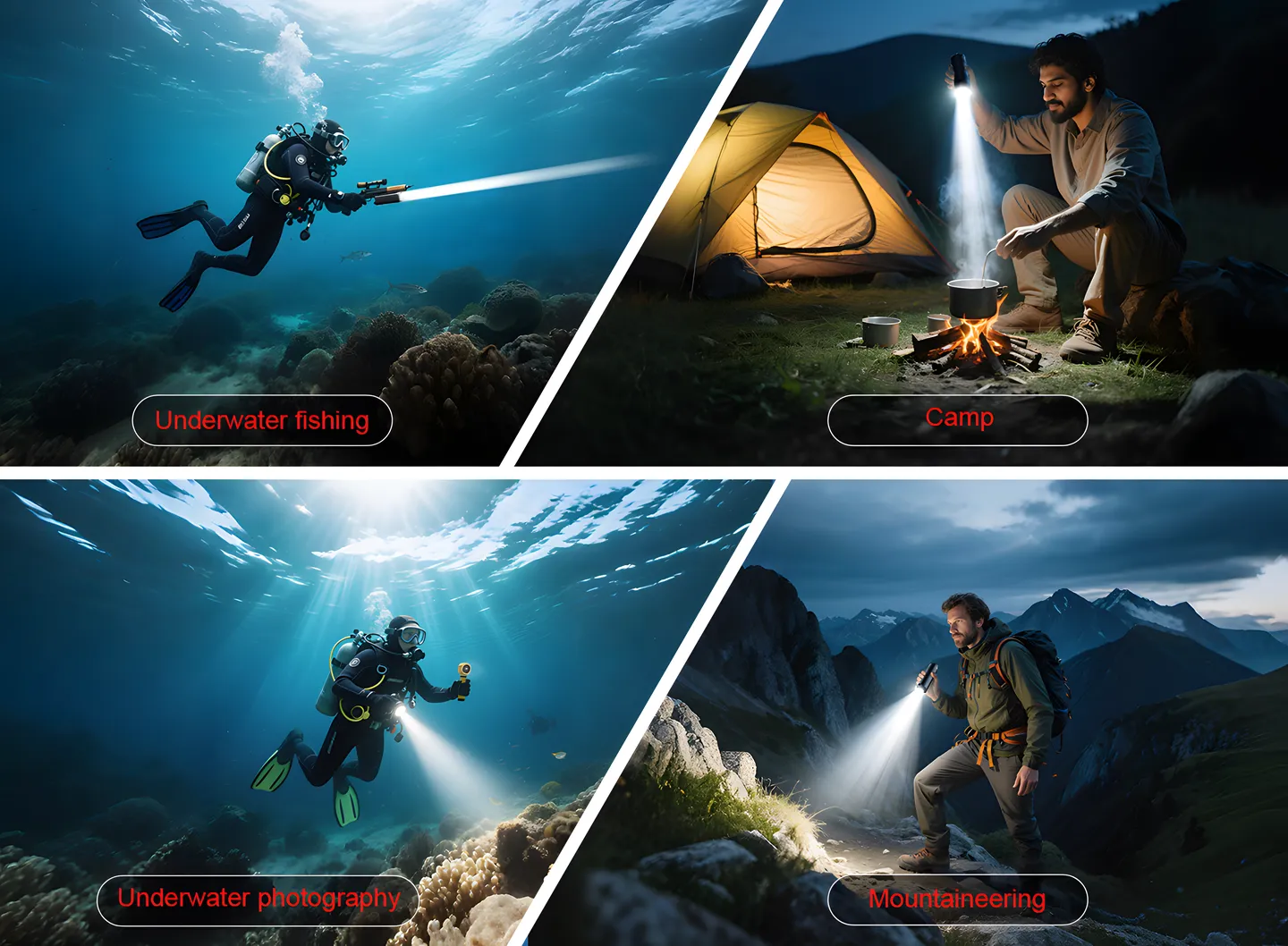 Designed for professional and technical divers, the FEREI W180II dive light delivers mission-critical illumination and reliability in extreme underwater environments. Its high-output multi-beam system enhances situational awareness, enabling clear object identification, safe navigation in dark or turbid waters, and effective communication through light signaling. The intuitive magnetic switch ensures rapid mode access under stress, while intelligent thermal and battery protection systems prevent failures during prolonged use. Built to withstand deep dives and harsh conditions, it serves as a trusted tool for underwater hunting, cave exploration, search and rescue, and night diving—where performance, durability, and safety are non-negotiable.