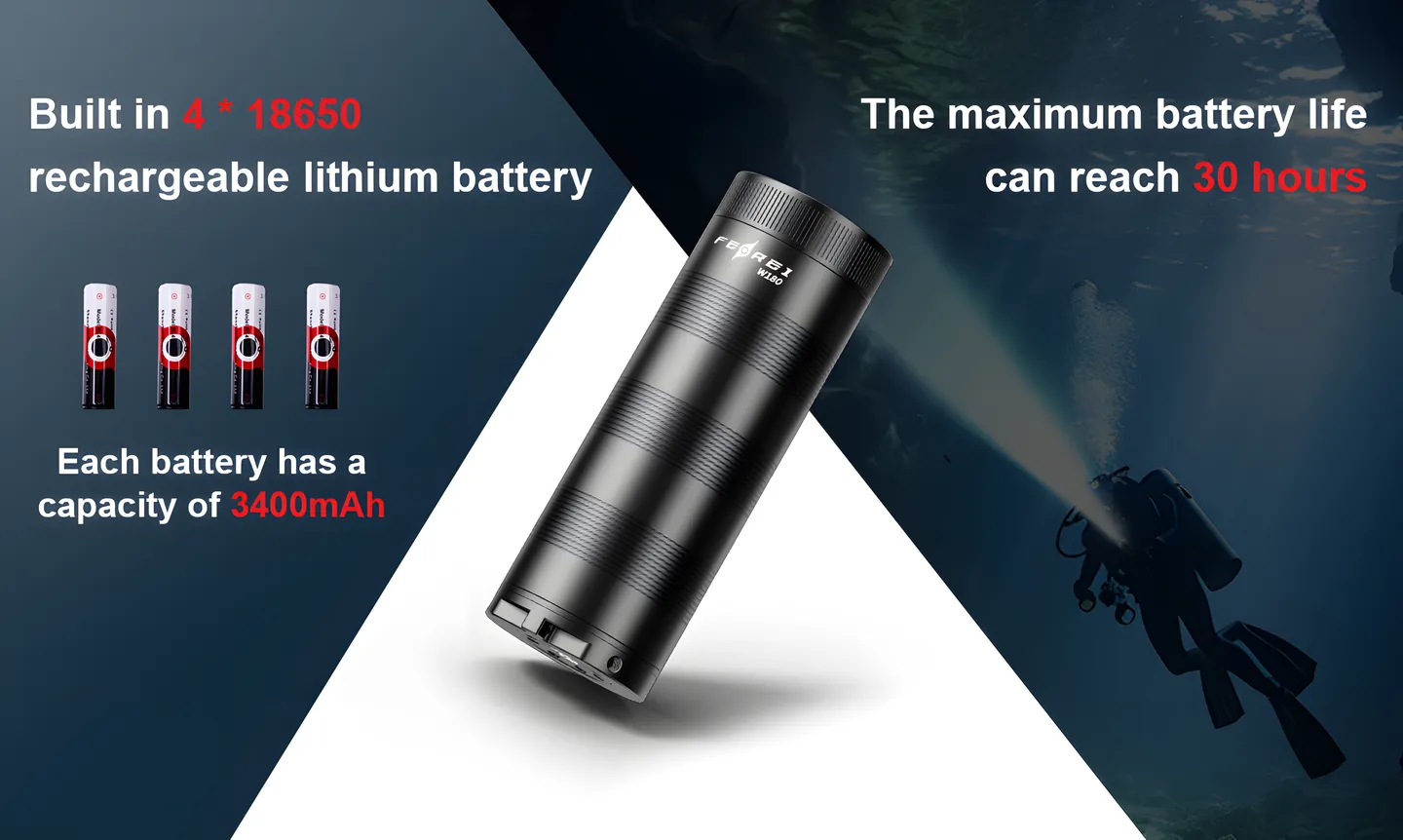 • Built-in 4*18650 rechargeable lithium battery set provides ultra-long runtime: 30 hours at 253 lumens