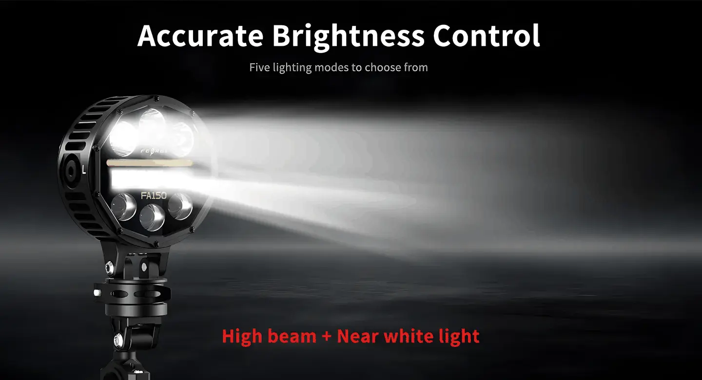 - LIGHT MODEL——Equipped with five selectable lighting modes including near white light+fog light,near white light, high beam + near white light,high beam + fog ligh, fog light., offering precise brightness control for various riding scenarios