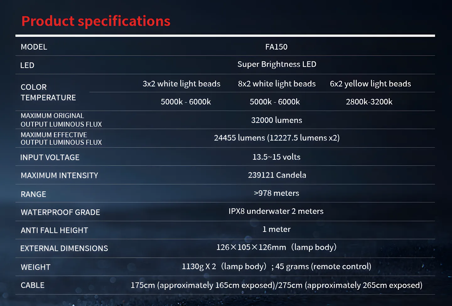 - Maximum light intensity: 90809candela;